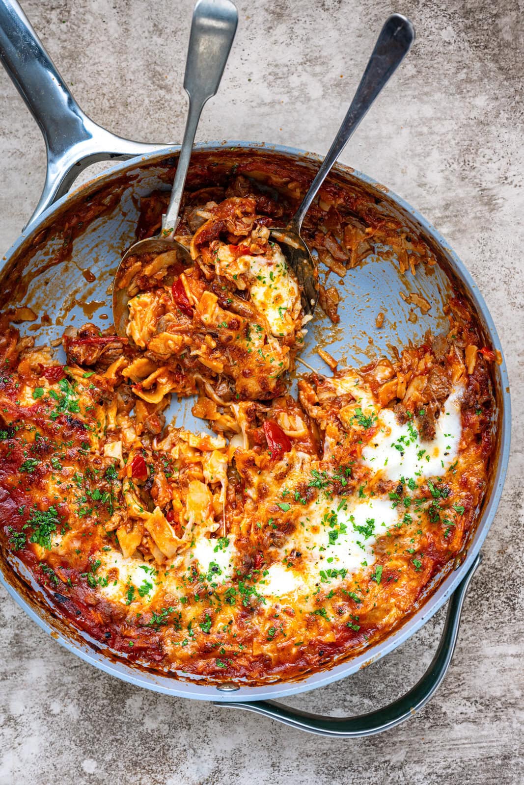 If you love the flavor of a slow-cooked lasagna but don’t have the time for the "fully layered real deal" this Skillet Lasagna is your new best friend. Lots of deep comforting flavor and melty cheese goodness, less washing and effort!